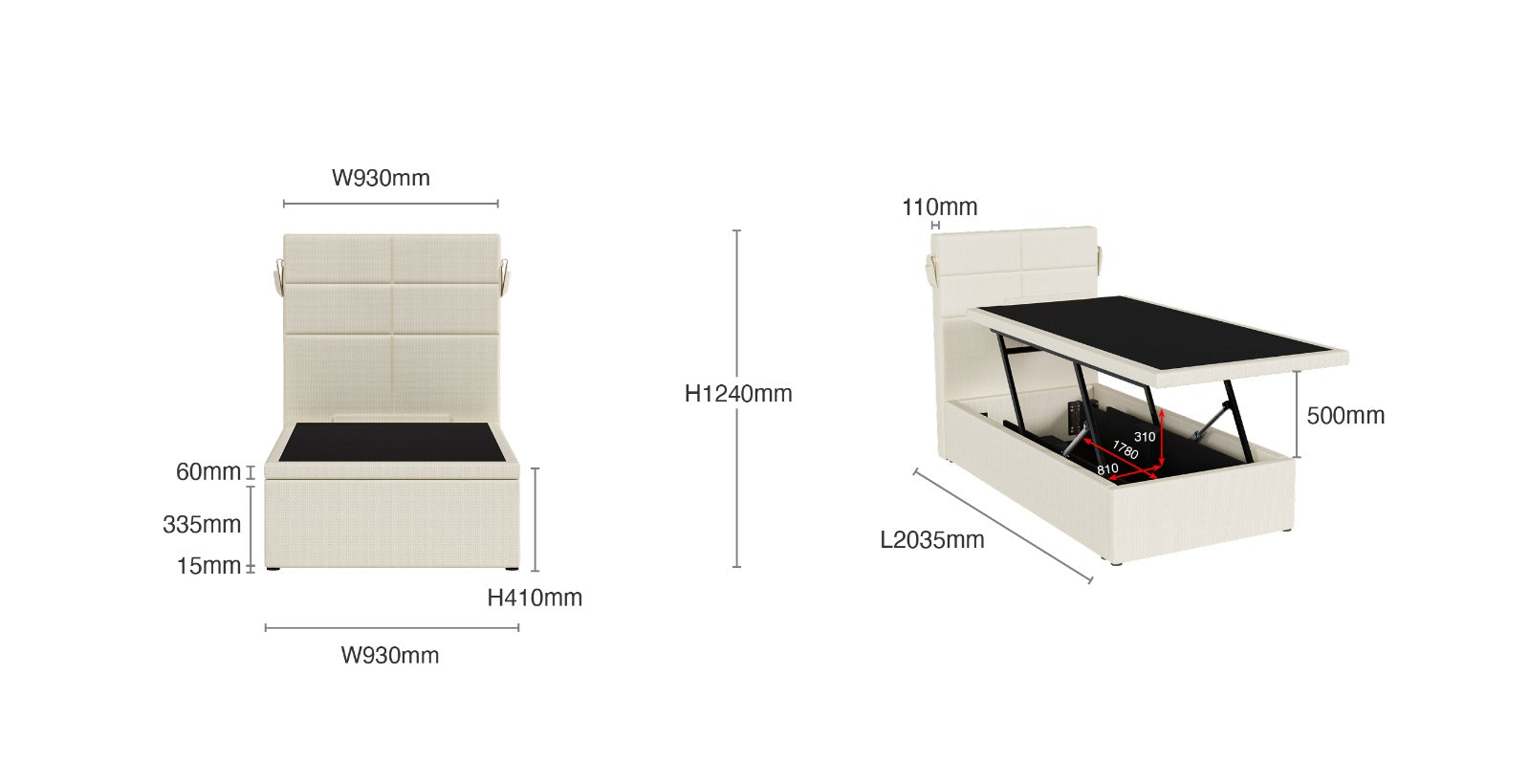 Single: L2035x W930 x H1240mm