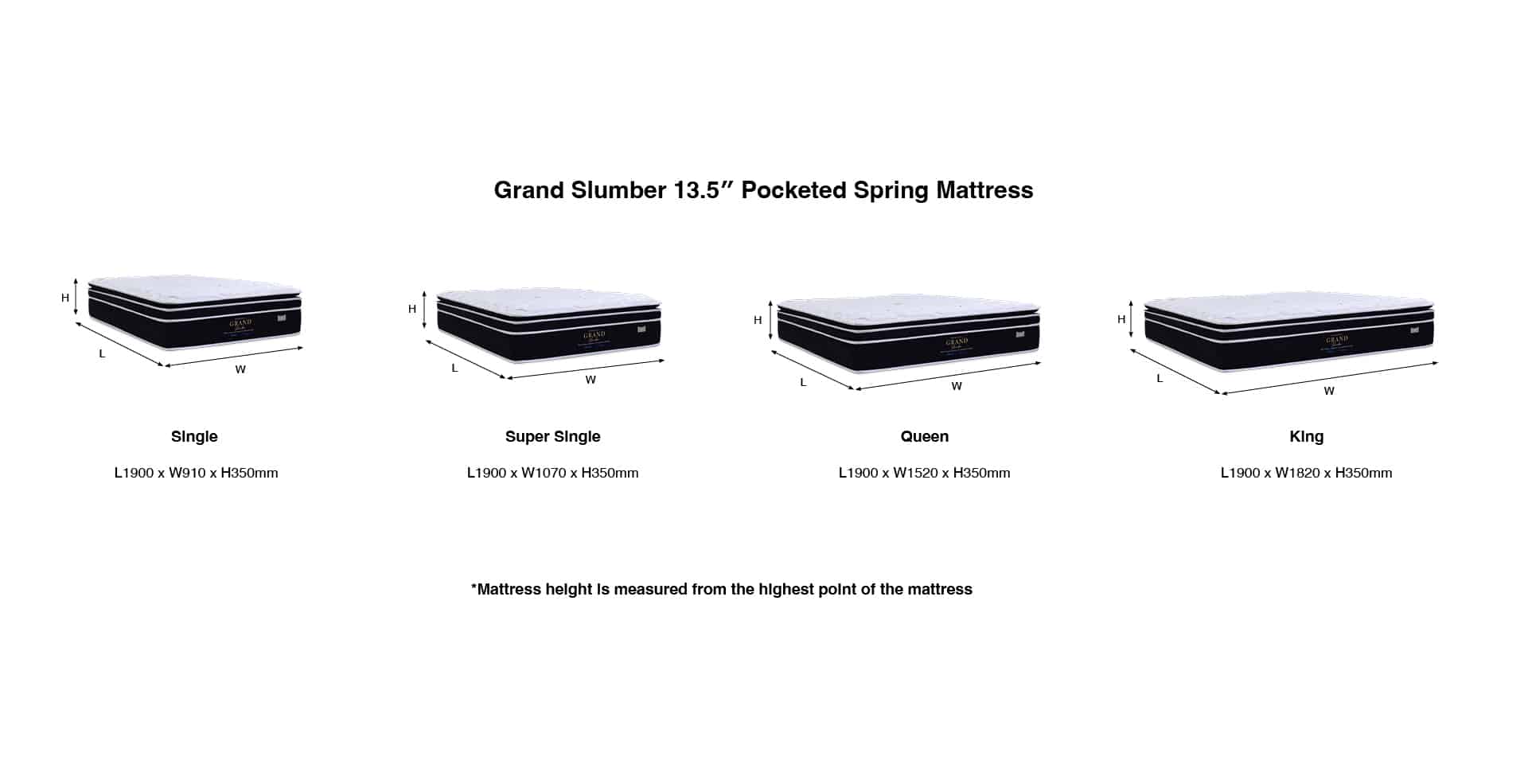 Super Single: L1900 x W1070 x H350mm