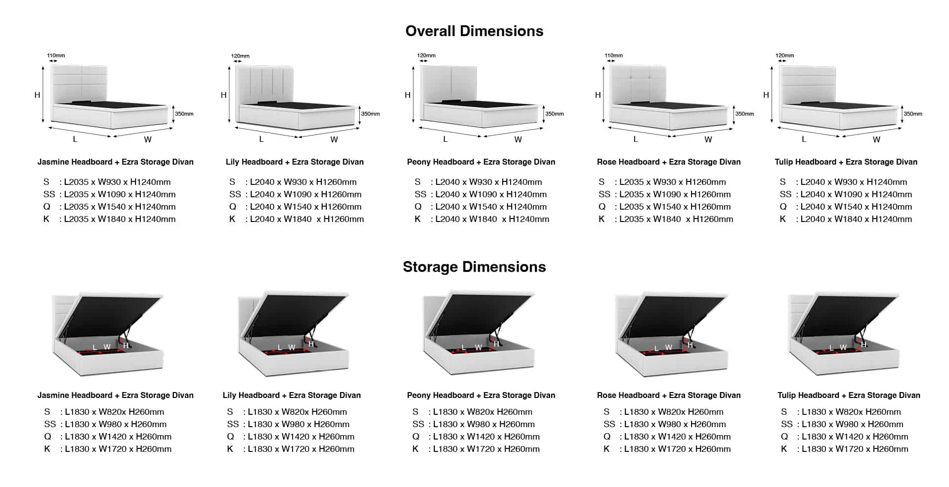 Queen: L1900 x W1520 x H350mm