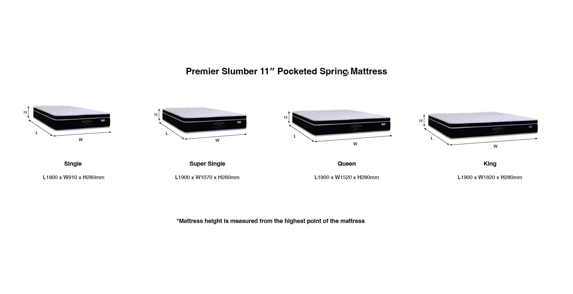 Super Single: L1900 x W1070 x H280mm